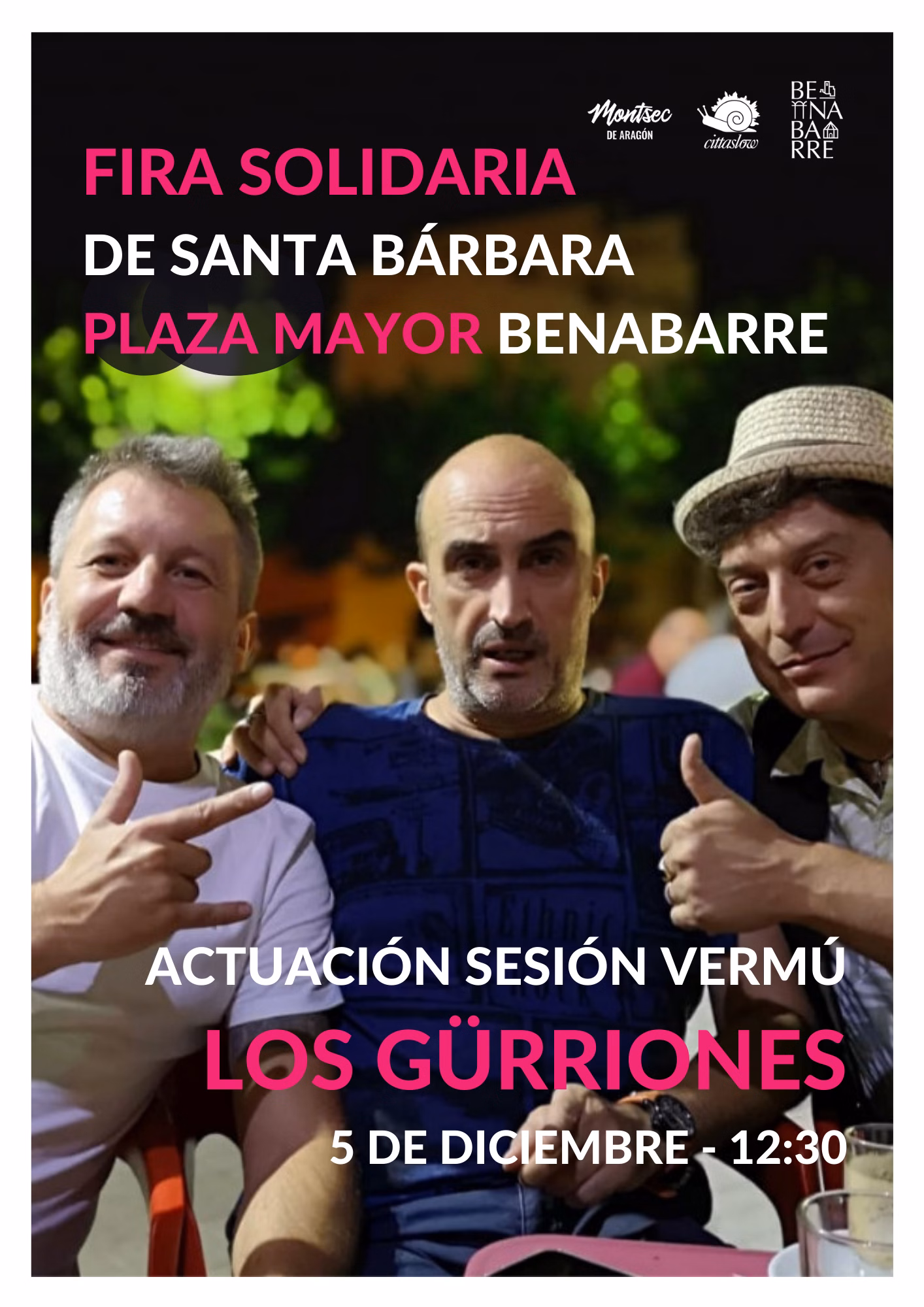 El 5 de diciembre en la Plaza Mayor de Benabarre a las 12:30h habrá un concierto de Los Gürriones. A continuación podrás ver el cartel de la actuación.